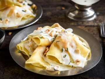 Delicate ravioli shells filled with a sweet, cinnamon-spiced apple pie filling. Finished with a silky-smooth vanilla sauce for an extra indulgent touch.